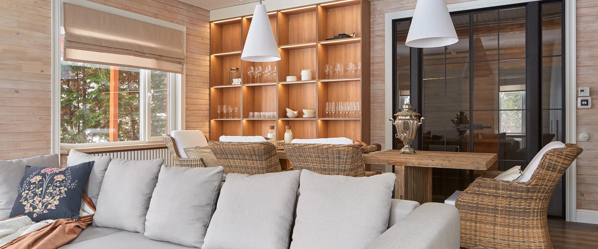 Благодаря продуманному дизайну и вниманию к деталям, гостиная превратилась в многофункциональное пространство, где можно наслаждаться фильмами и природой в любое время года. Как отметили авторы проекта, даже такие элементы, как розетки и выключатели, сыграли важную роль в создании целостного образа.