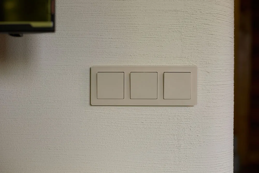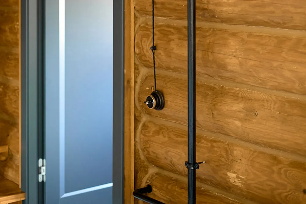 Особое внимание уделили электроустановочным изделиям, которые стали важной частью интерьера. Проводка выполнена из ретро-коллекции: оплетка кабеля имитирует шелк, что подчеркивает историческую атмосферу сруба. Поворотные выключатели с матовыми ручками-барашками гармонично вписываются в общую концепцию. Все механизмы изготовлены из негорючего поликарбоната, а контактные группы выполнены из фосфорной бронзы, что гарантирует безопасность и долговечность. На остальных стенах разместили розетки из коллекции Acrilic в цвете «айвори» с рамками из акрилового стекла и изящной тонкой фаской, добавляя интерьеру лёгкости и элегантности .